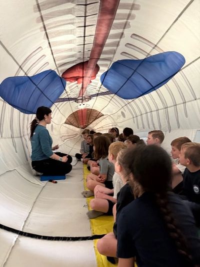 Students enter Nile, our life-sized inflatable whale, and sit on the floor inside a realistic model of a whale's internal anatomy. Visible structures—such as the heart, lungs, ribs, stomach, and intestines—all support visual learning. During the 20-minute session, one of our educators explains how the organs function, how whales breathe and eat, and how they are adapted to live in the ocean. The session also includes how scientists study whales, the challenges they face in the wild, and concludes with a discussion about whale poop—what it tells us and why it matters for ocean health.